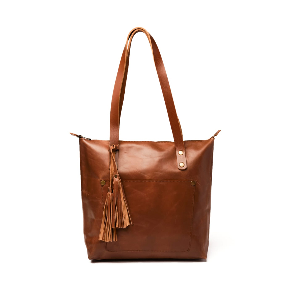 Elegant Tan Leather Tote Bag with Double Handle and Brass Buckle Details