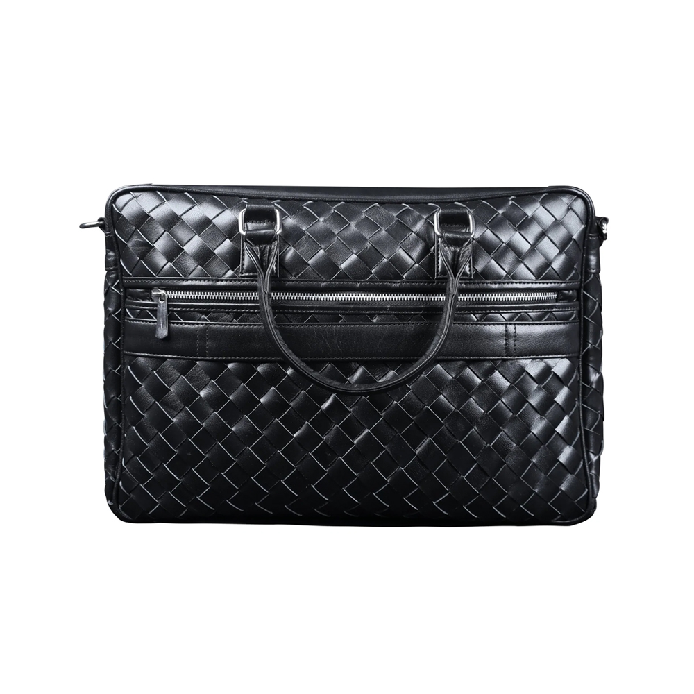 Elegant Woven Black Leather Laptop Bag with Dual Zipper Pockets and Handle