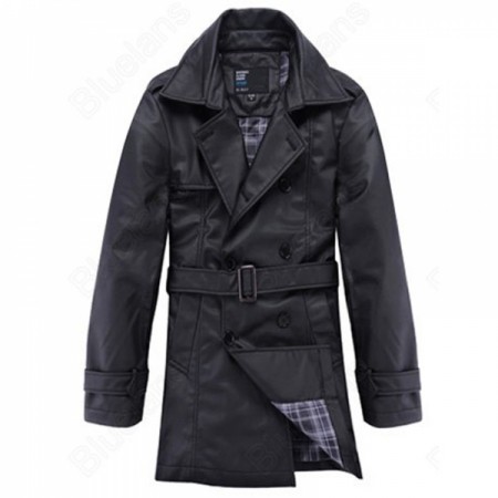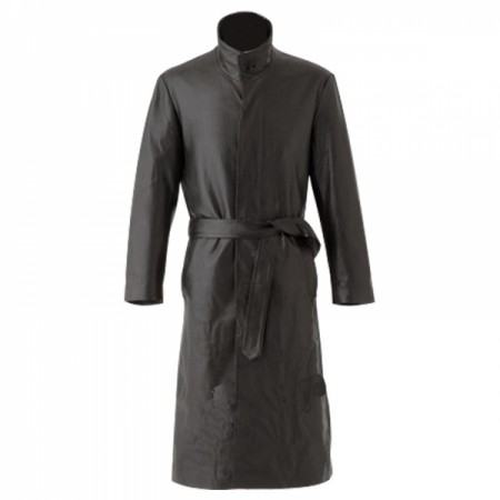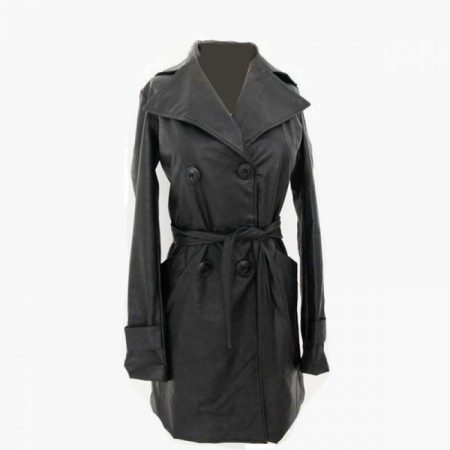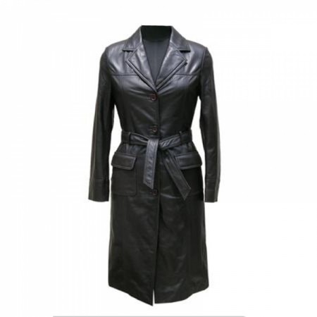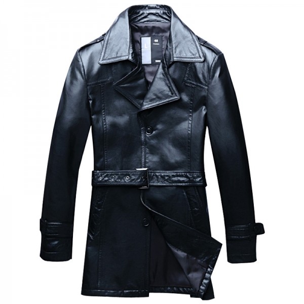 Classic Long Black Leather Coat with Belt and Utility Pockets